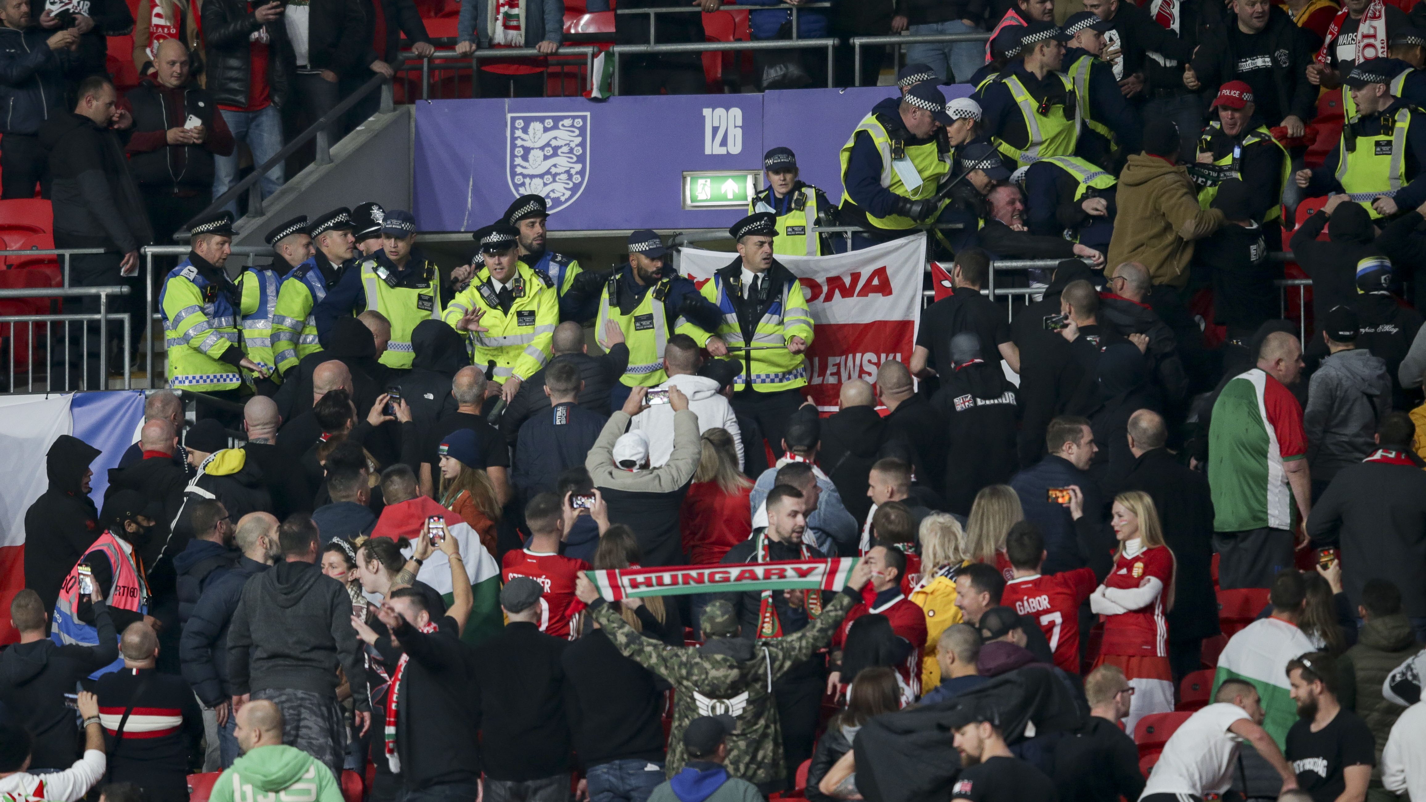 A BBC szerint nincs teljes nyugalom a Wembleyben, a magyar szektorban ugyanis verekedés tört ki, a rendezőknek kellett bemenniük, de a drukkerek